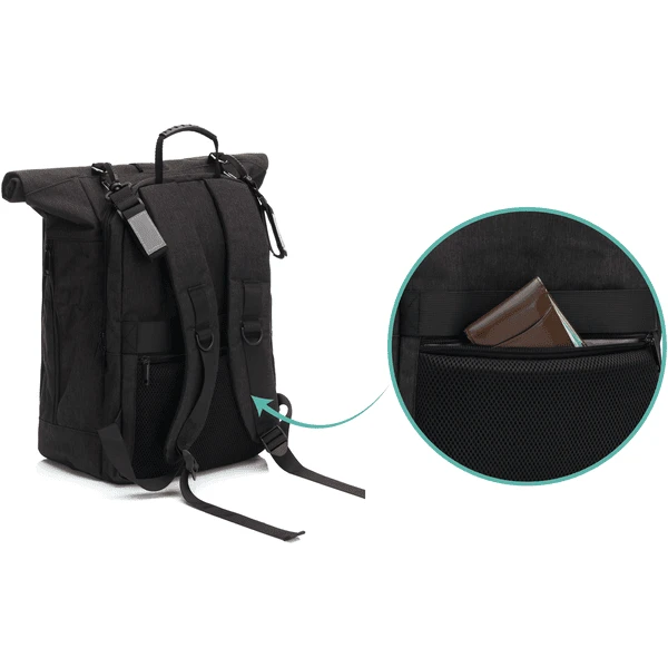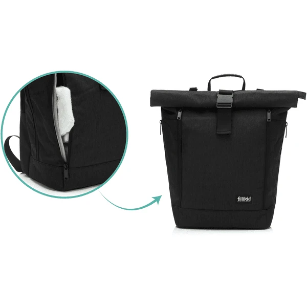 De Dublin luierrugtas is niet alleen chic om te zien, maar ook heel praktisch. Met de rolsluiting kan het volume worden vergroot van 22 liter tot 25 liter en zelfs tot 27 liter als hij helemaal open is. Met de praktische kliksluiting kan de rugzak in enkele seconden worden geopend. Bovendien is er een groot extra vak aan de achterkant waar u belangrijke dingen voor uw kind kunt opbergen, zoals kleren of een deken, of later een laptop, tijdschriften of andere platte voorwerpen! Via de twee ritssluitingen aan de voorkant komt u bij een praktisch vak dat enerzijds plaats biedt aan het bijgeleverde verschoningsmatje en anderzijds ook rechtstreeks in de binnenkant van de rugzak kan als u spullen nodig hebt die ver naar beneden liggen. Een klein extra vakje op de rug biedt bovendien veilige opbergruimte voor uw portefeuille, sleutels of andere belangrijke voorwerpen en beschermt u zo op betrouwbare wijze tegen dieven. Boven dit vak bevindt zich ook de trolleyband waarmee de rugzak kan worden vervoerd.