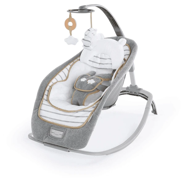 Deze modern e schommelstoel heeft een unieke rugleuning met drie zeer verschillende standen om uw baby zo comfortabel mogelijk te houden. Dit zitje schommelt, maar kan ook worden omgebouwd tot een vast zitje met rustgevende trillingen, natuurgeluiden en muziek. De speelgoedstang kan worden verwijderd zodat het zitje een praktische schommelstoel wordt als uw baby groter wordt.