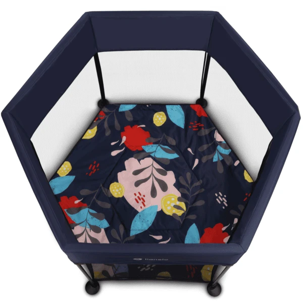 De wanden van de Roel box zijn gemaakt van doorzichtig en luchtig materiaal dat een goede luchtstroom en continue observatie van het kind mogelijk maakt. De stijfheid van het materiaal toont aan dat het product zijn stabiele positie behoudt en dat de zijkanten niet uitrekken. Het bovenste deel van de box, dat de bindingen bevat van Metal lelements die het in- en uitvouwen mogelijk maken, is beveiligd met een brede plaat die de stabiliteit van de structuur versterkt en mogelijke verwondingen tijdens het spelen voorkomt. De afneembare pads kunnen worden gewassen in een fijnwasprogramma op 30°C zonder te centrifugeren.