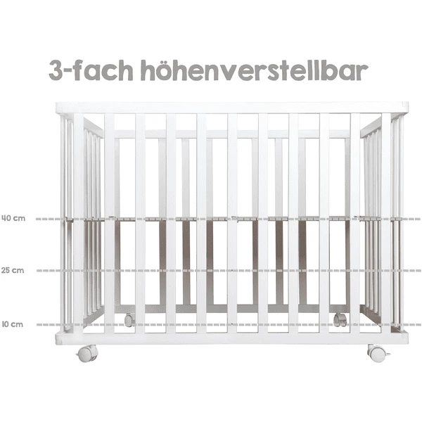 De roba box ‘Sternenzauber grau’ in de kleur wit biedt een kindvriendelijk en stabiel speel- en knuffeloppervlak van 75 x 100 cm en is voorzien van een zacht gewatteerde, gewatteerde grijze stoffen inzet. De roba box is babyvriendelijk en splintervrij. De bovenste stand van de in 3 standen in hoogte verstelbare boxbodem is voor u als ouders bijzonder rugvriendelijk. Vier remrollen zorgen voor de nodige mobiliteit en stabiliteit van deze box. Alle in de box gebruikte materialen zijn getest op schadelijke stoffen en gecertificeerd. Bovendien worden zij tijdens de fabricage regelmatig getest. De box is ontwikkeld volgens de EN 12227:2010 norm. Het stoffen inzetstuk van de 4-hoekige roba box ‘ roba Style ‘ is uitneembaar en wasbaar op 40° C. De babybox heeft de afmetingen 72,5 x 75 x 100 cm (HxBxD) en is belastbaar tot een gewicht van 15 kg.